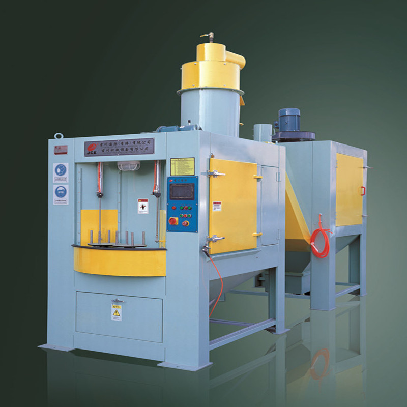 轉(zhuǎn)盤式自動噴砂機又叫轉(zhuǎn)臺式自動噴砂機、間隙式自動噴砂機、連續(xù)式自動噴砂機。他也是一款高產(chǎn)能、高效率的自動噴砂機。噴砂大轉(zhuǎn)盤上上配置8個小轉(zhuǎn)盤,又分為4個區(qū)域,噴砂裝卸區(qū)、噴砂待加工區(qū)、噴砂加工區(qū)、吹凈室。 需要噴砂機的產(chǎn)品人工放在噴砂裝卸區(qū)。大轉(zhuǎn)盤會自動旋轉(zhuǎn),整個旋轉(zhuǎn)在360°人工只需要站在同一位置將產(chǎn)品裝、卸即可。 用戶也可根據(jù)自己的一些產(chǎn)量要求配置流水作業(yè),但是配置裝、卸區(qū)一般需要機械手,成本較高。 轉(zhuǎn)盤式自動噴砂機適用于盤類、圓柱類、方形工件的內(nèi)外表面噴砂批量生產(chǎn),如工藝品、玻璃燈罩、不粘鍋、手電筒、烤盤、不銹鋼洗手盆、通訊器材等工件。